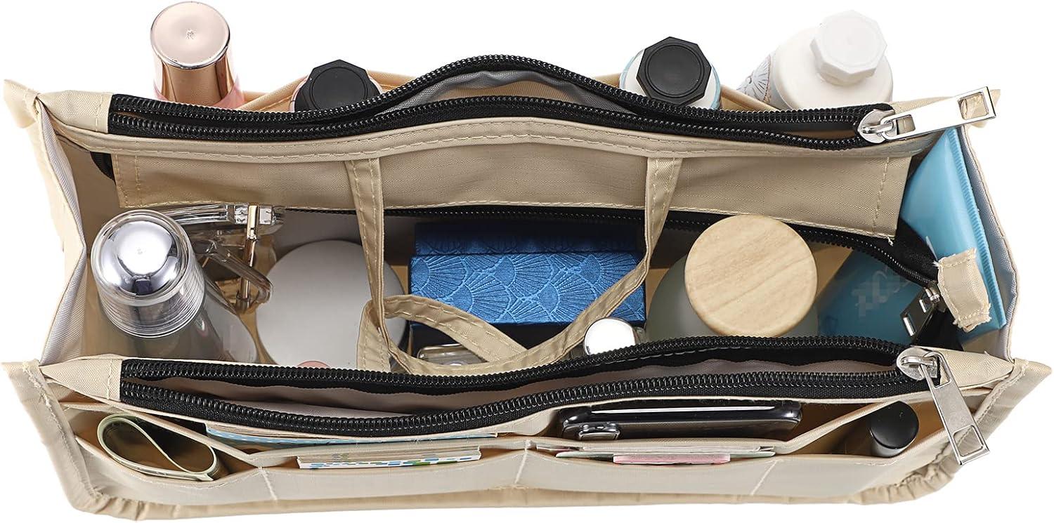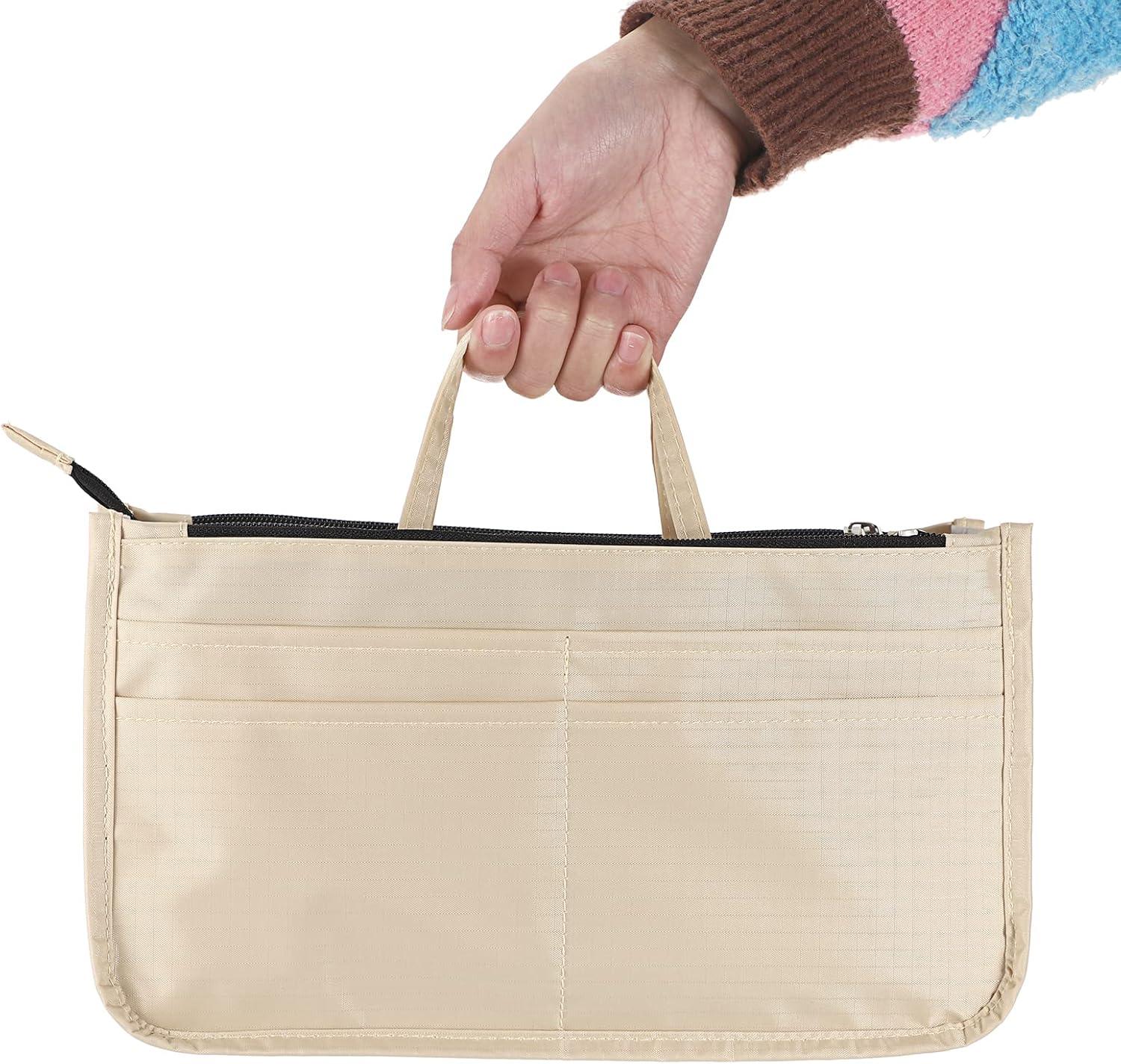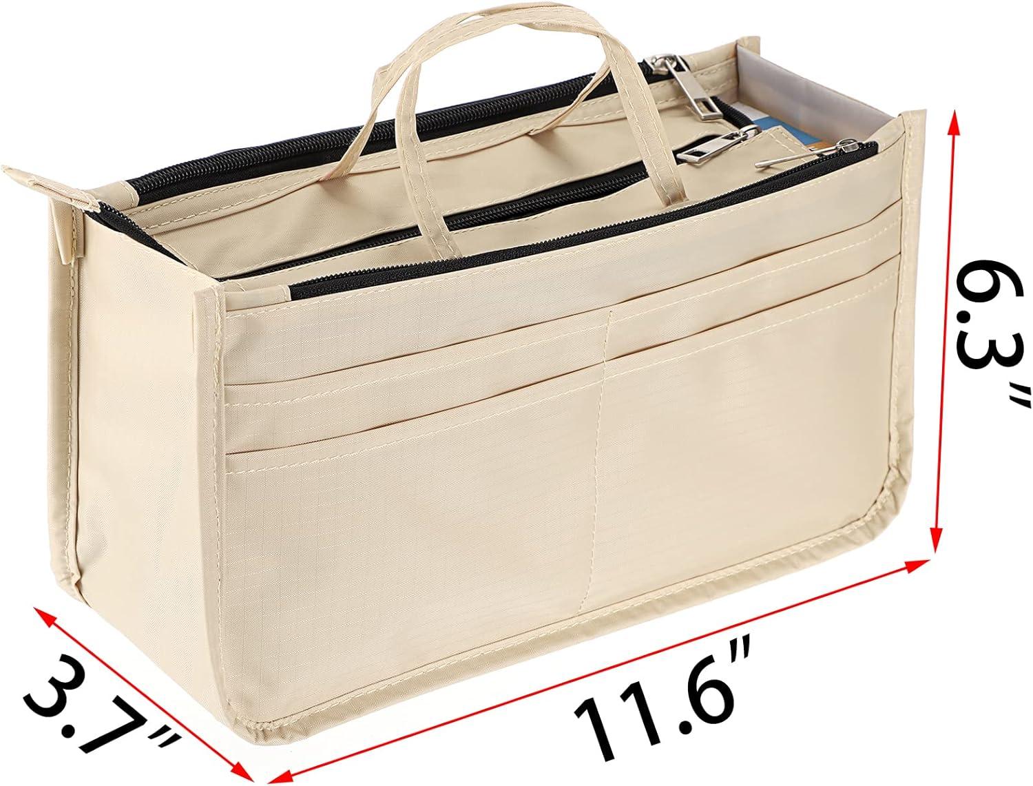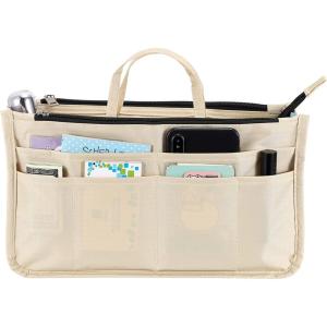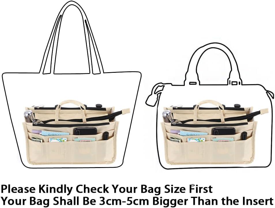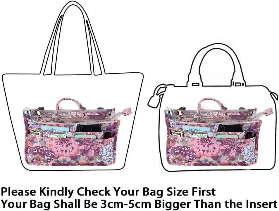 BTSKY Printing Handbag Organizers Inside Purse Insert – High Capacity 13 Pockets Bag Tote Organizer with Handle (Peony)(Beige)