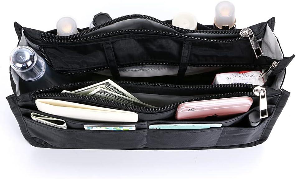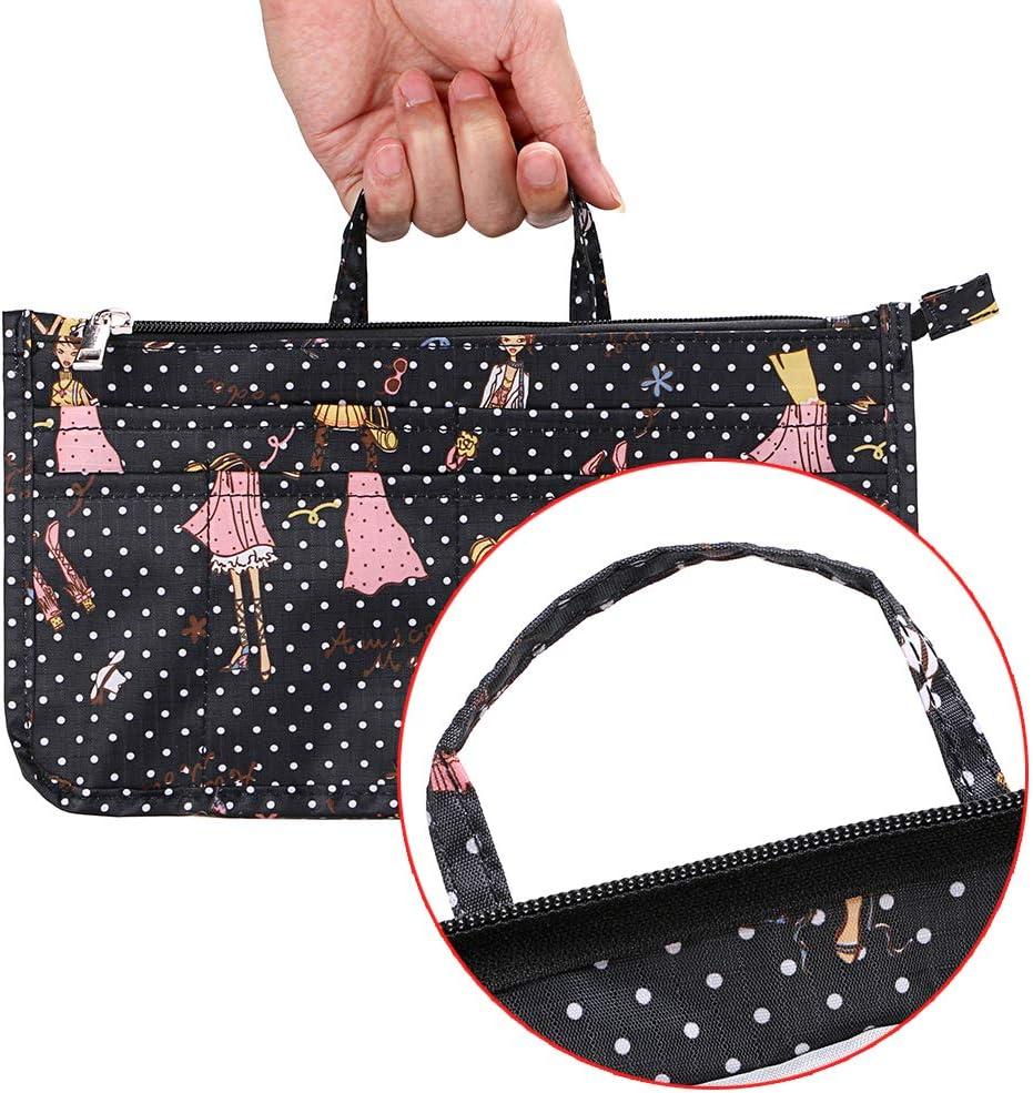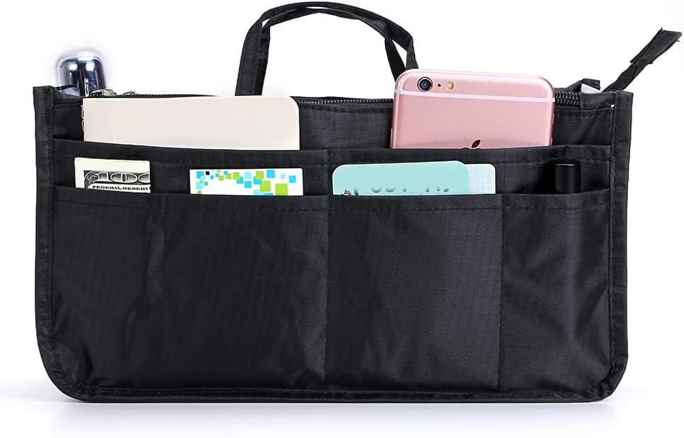 BTSKY Printing Handbag Organizers Inside Purse Insert – High Capacity 13 Pockets Bag Tote Organizer with Handle (Peony)(Black+Pink)