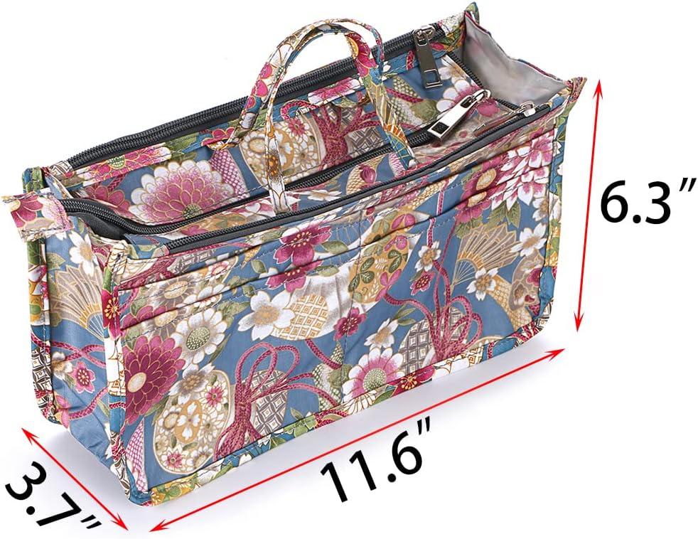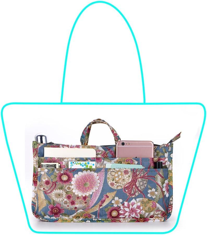 BTSKY Printing Handbag Organizers Inside Purse Insert – High Capacity 13 Pockets Bag Tote Organizer with Handle (Peony)(Blue+Pink)