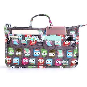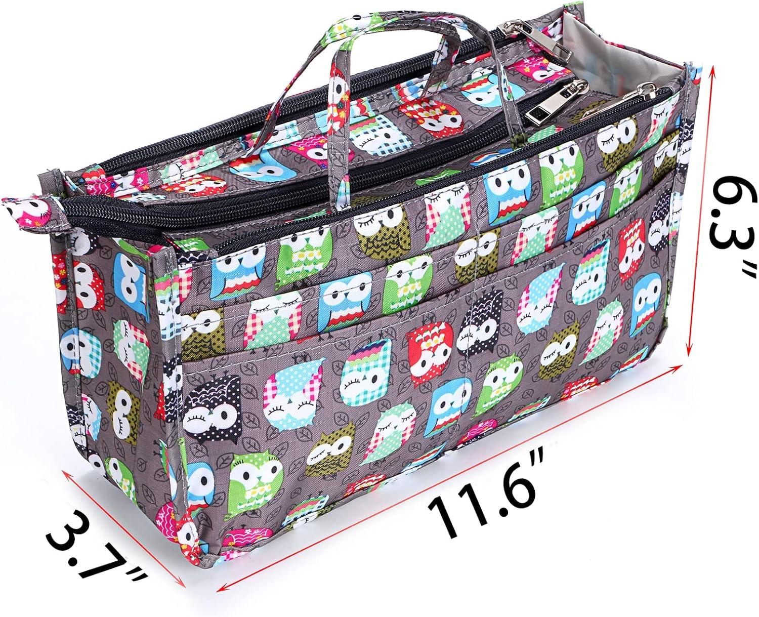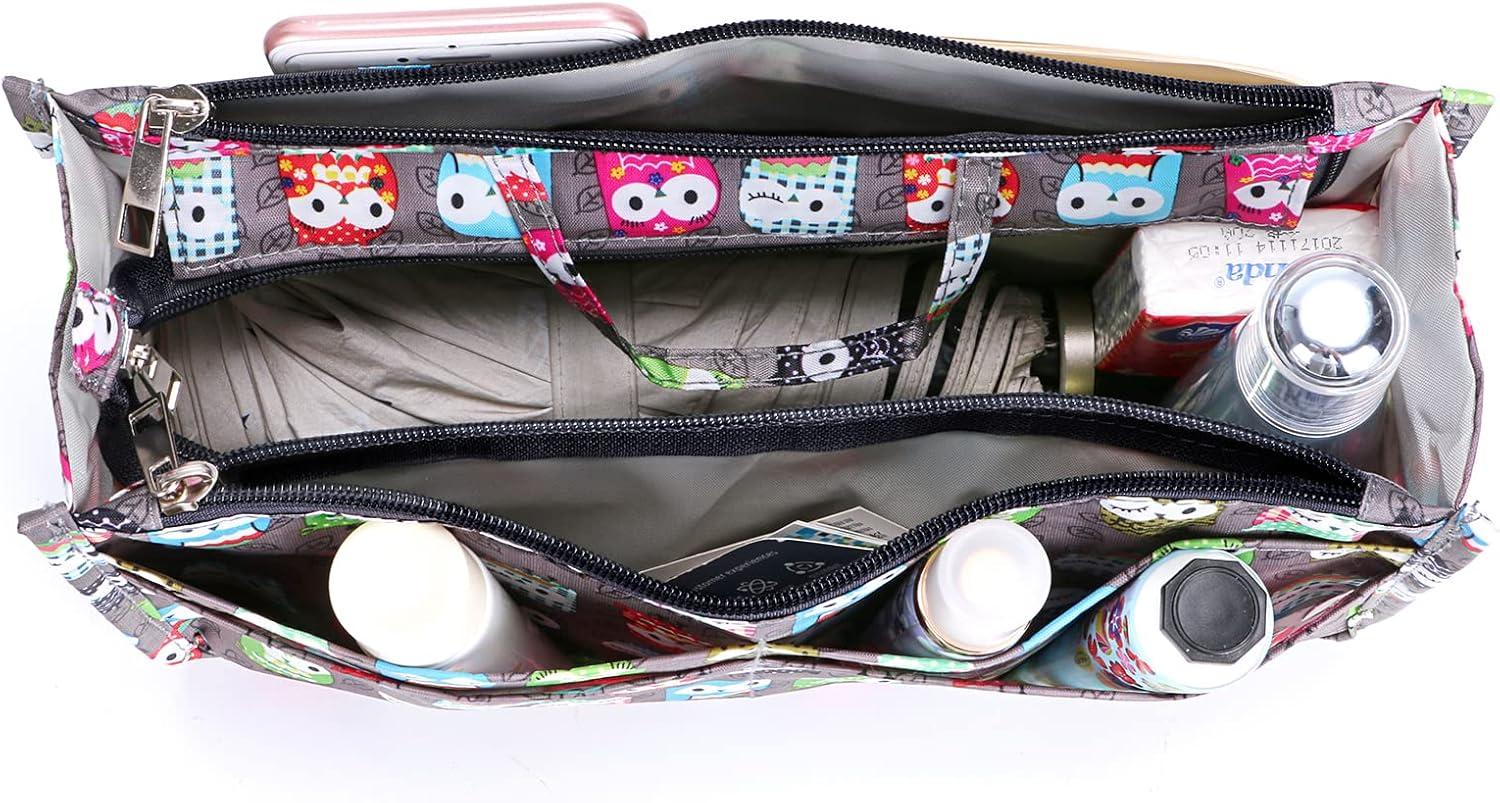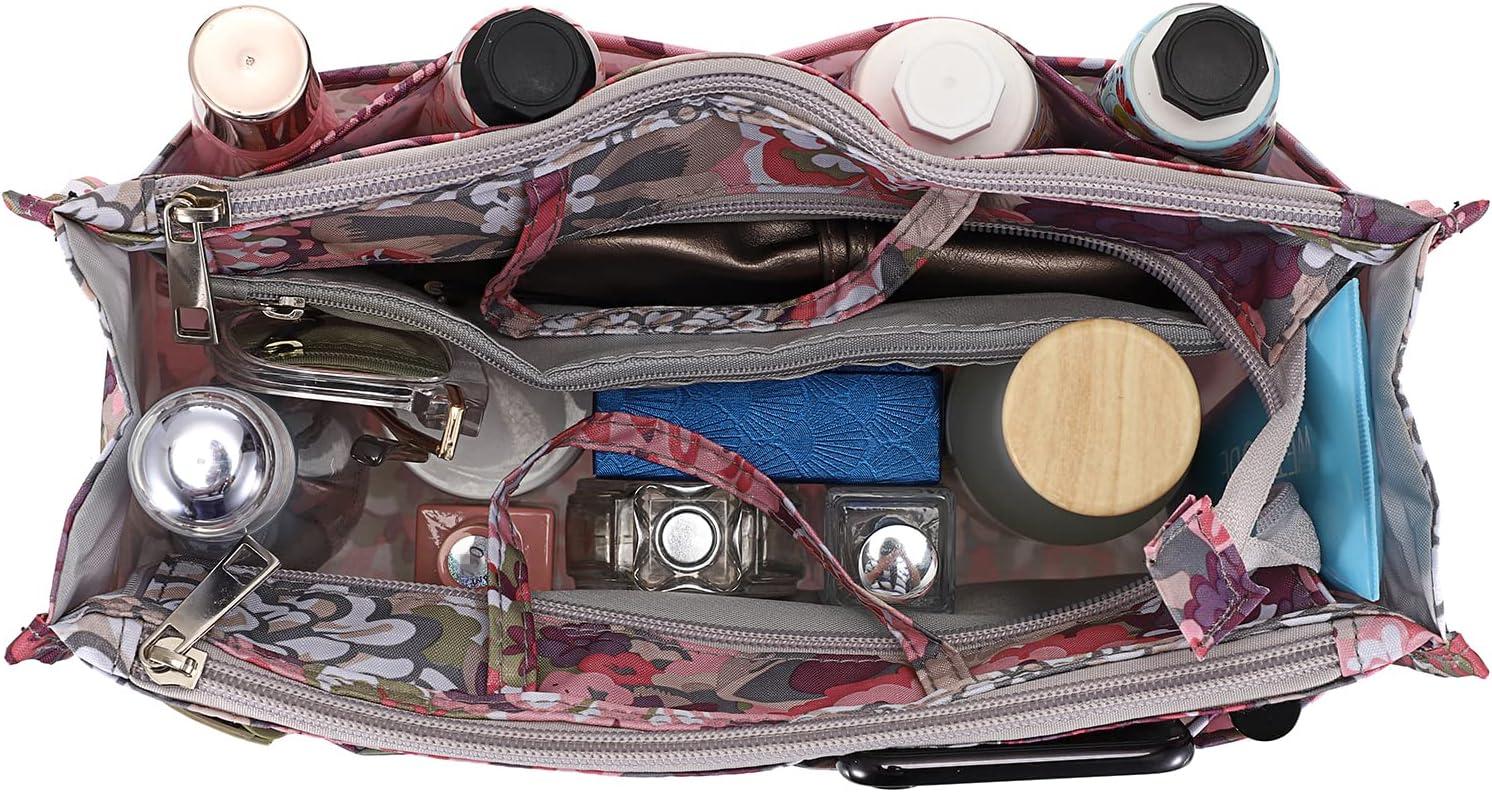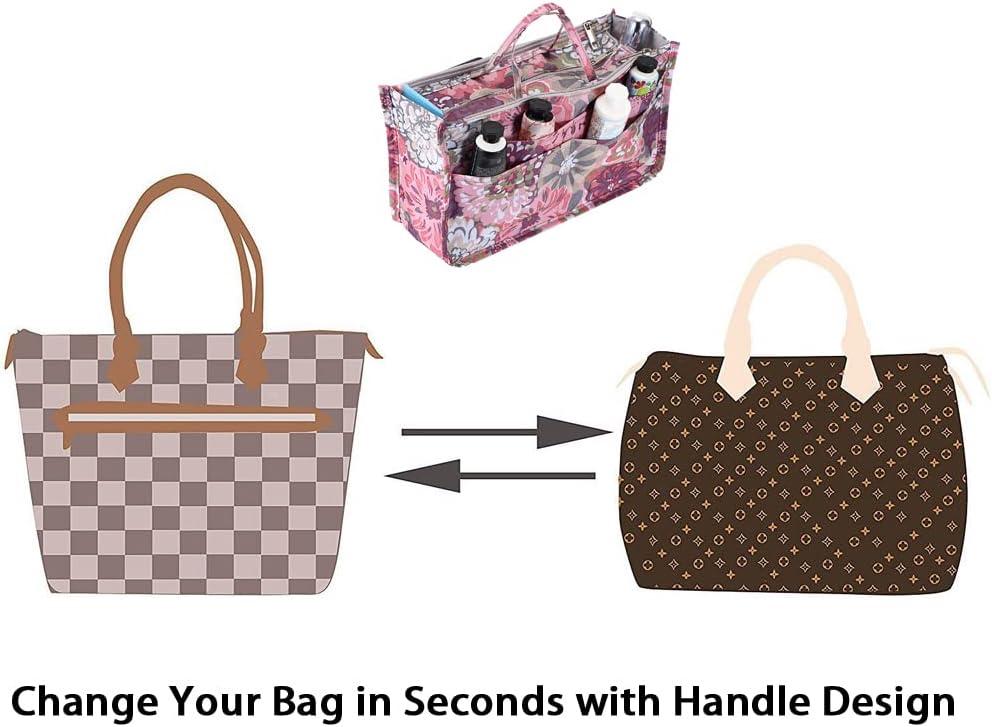 BTSKY Printing Handbag Organizers Inside Purse Insert – High Capacity 13 Pockets Bag Tote Organizer with Handle (Peony)(Brown)