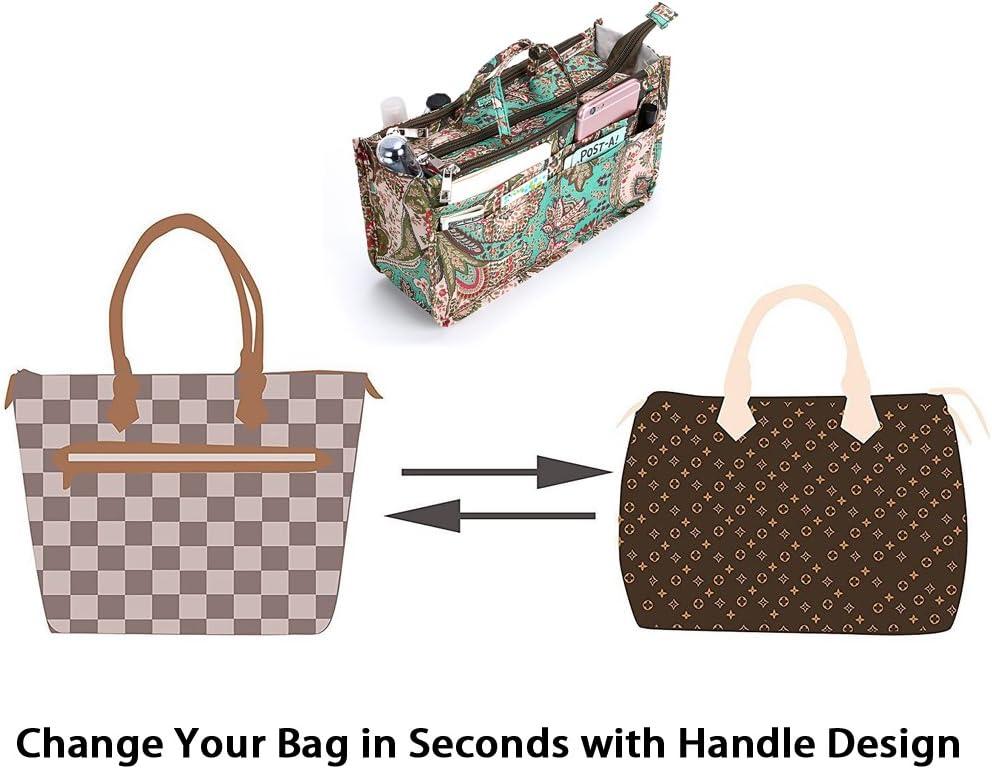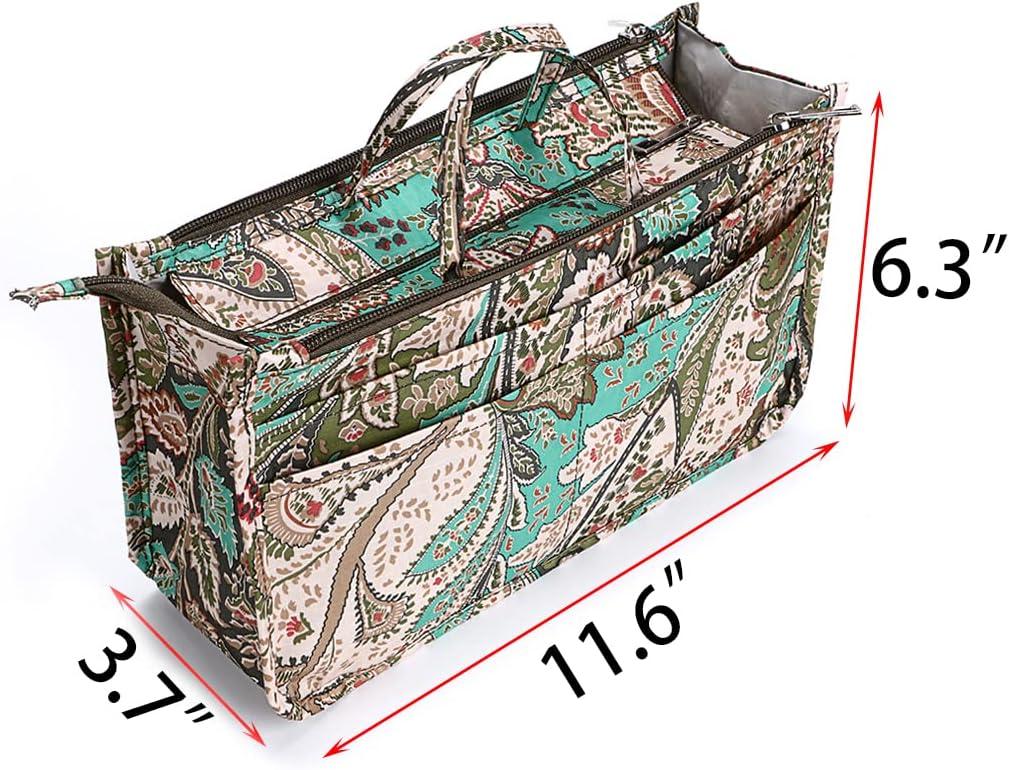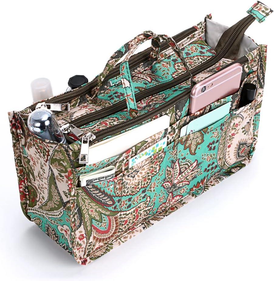 BTSKY Printing Handbag Organizers Inside Purse Insert – High Capacity 13 Pockets Bag Tote Organizer with Handle (Peony)(Green+Brown)