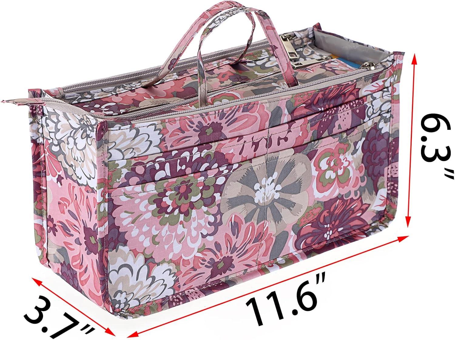 BTSKY Printing Handbag Organizers Inside Purse Insert – High Capacity 13 Pockets Bag Tote Organizer with Handle (Peony)(Pink)