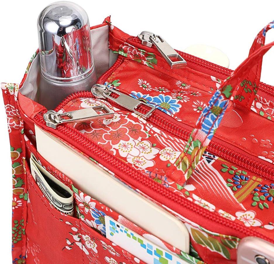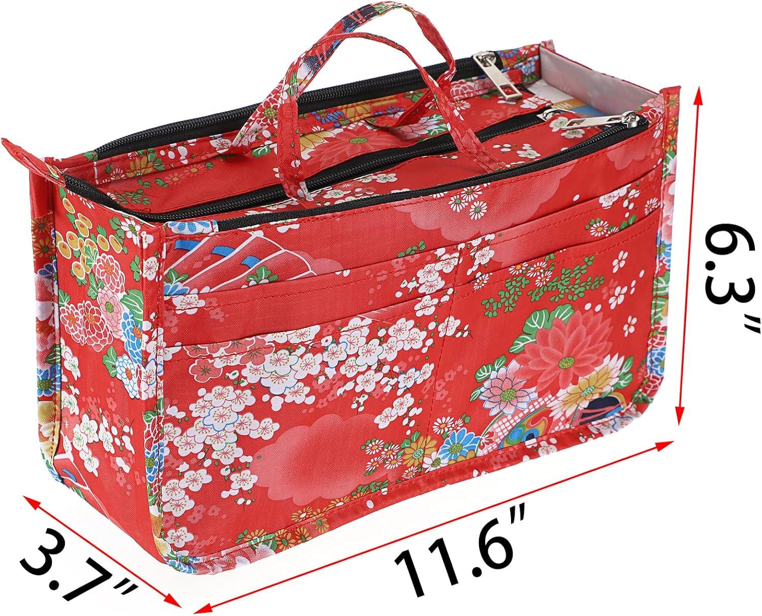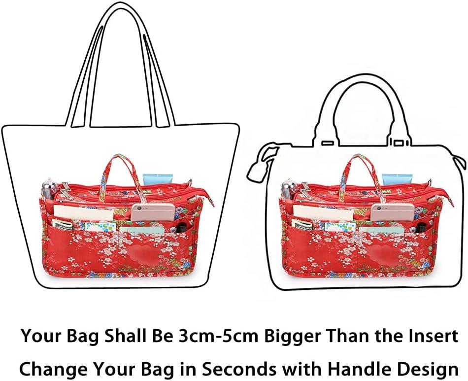 BTSKY Printing Handbag Organizers Inside Purse Insert – High Capacity 13 Pockets Bag Tote Organizer with Handle (Peony)(Red)