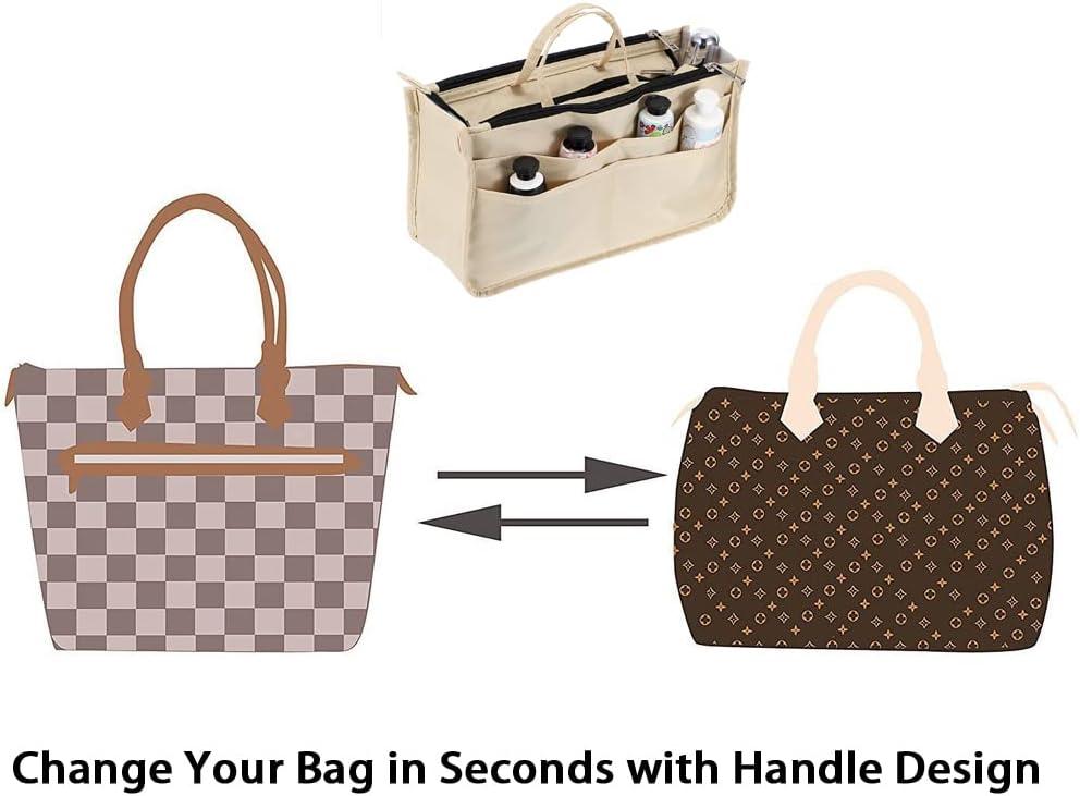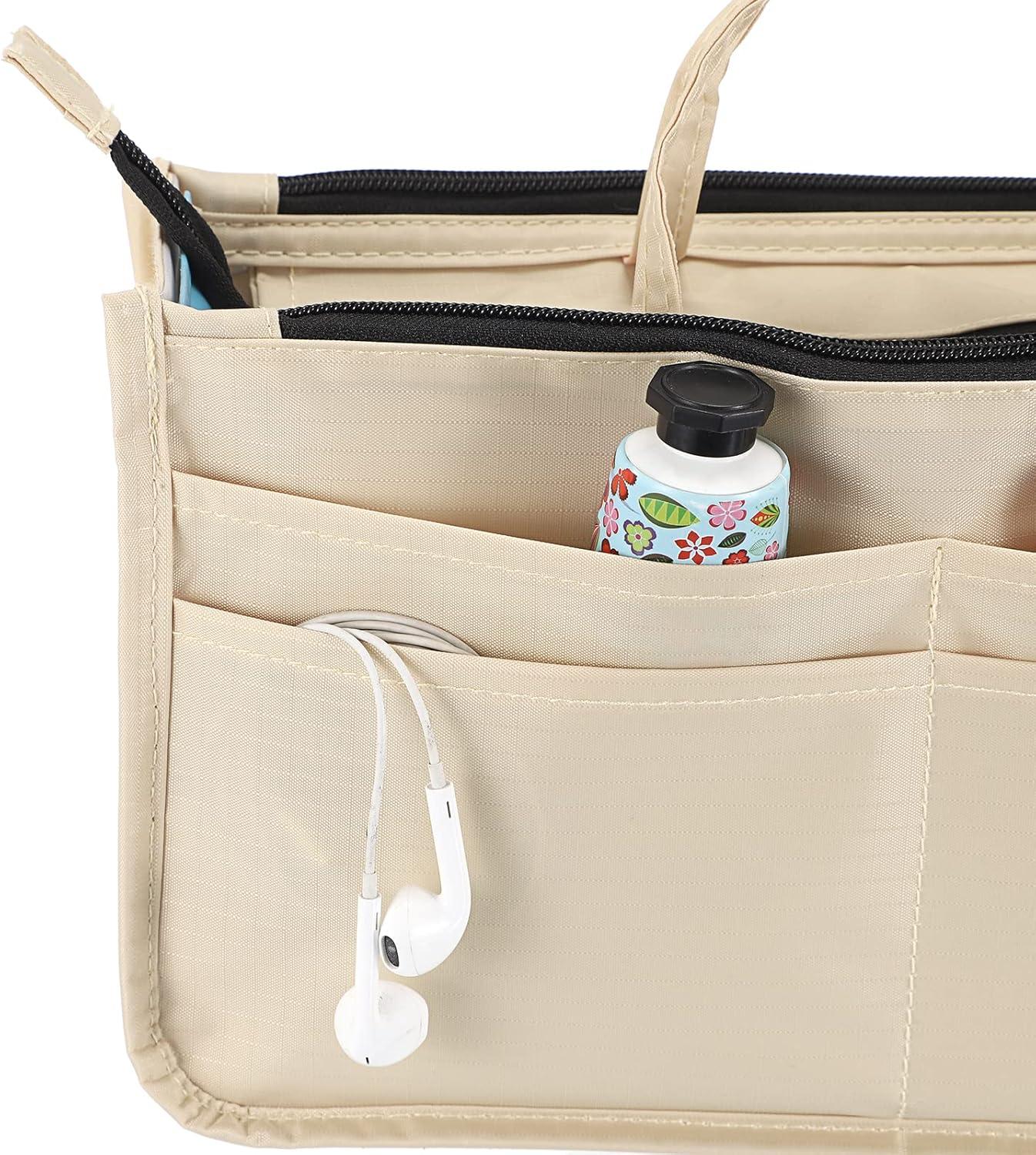 BTSKY Printing Handbag Organizers Inside Purse Insert – High Capacity 13 Pockets Bag Tote Organizer with Handle (Peony)(Beige)